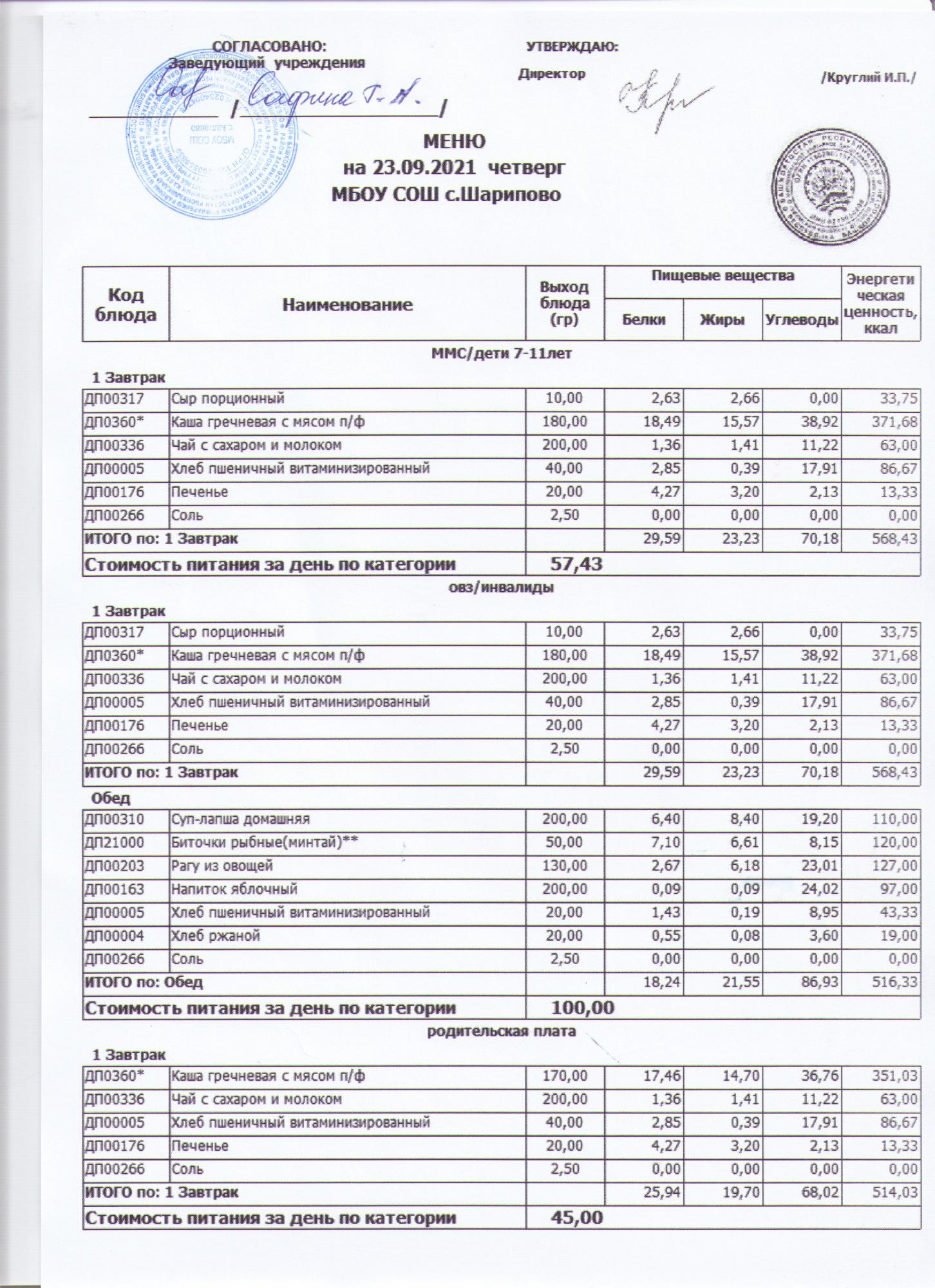 МЕНЮ НА 23.09.21 ШКОЛА