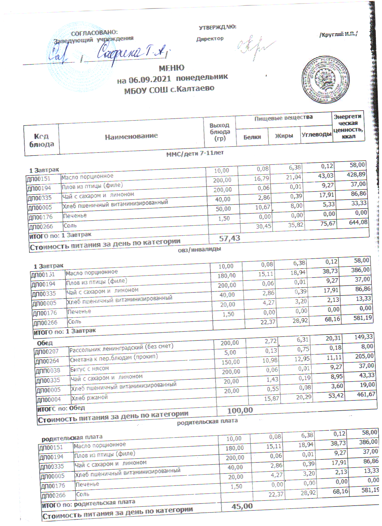 меню на 06.09.2021 школа
