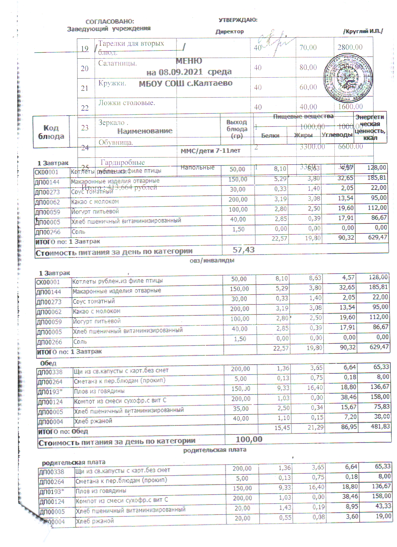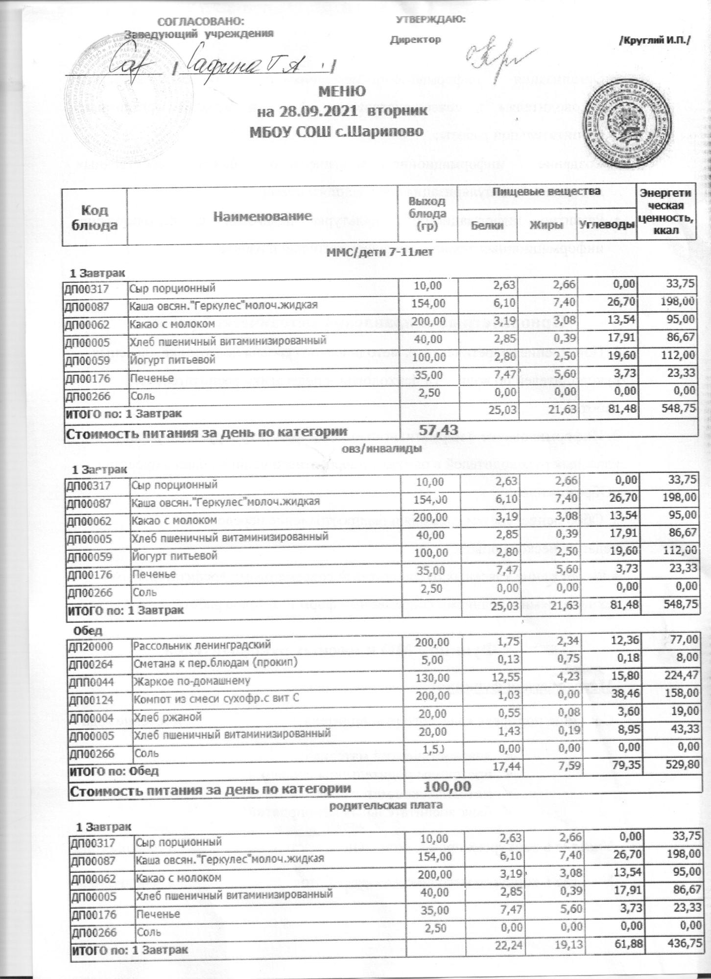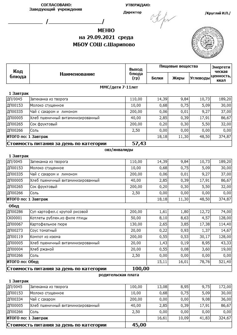 МЕНЮ НА 29.09.2021 ШКОЛА