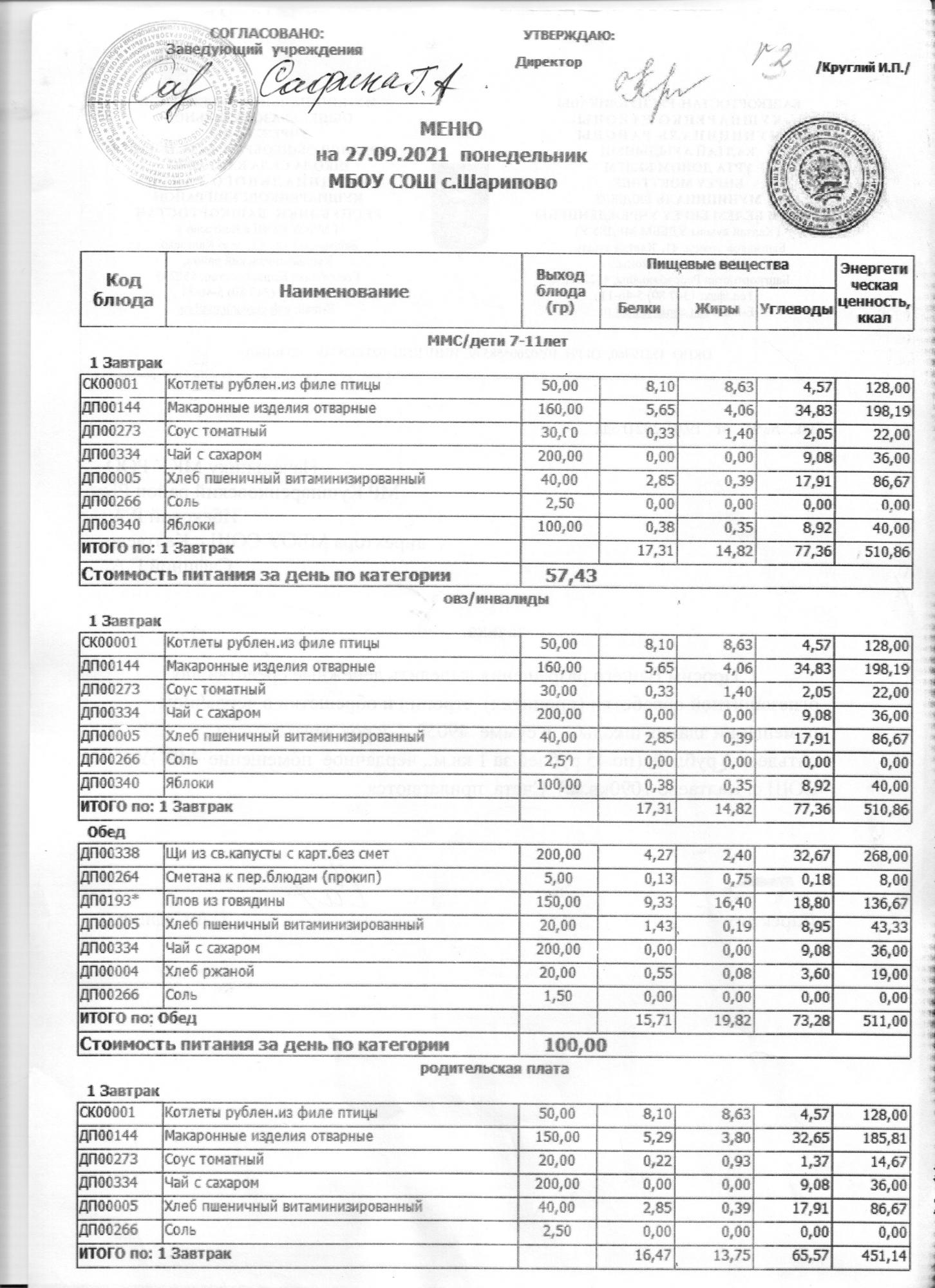 меню на 27.09.2021 школа