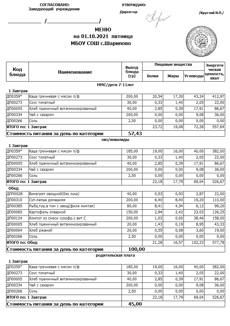 меню на 01.10.2021 школа
