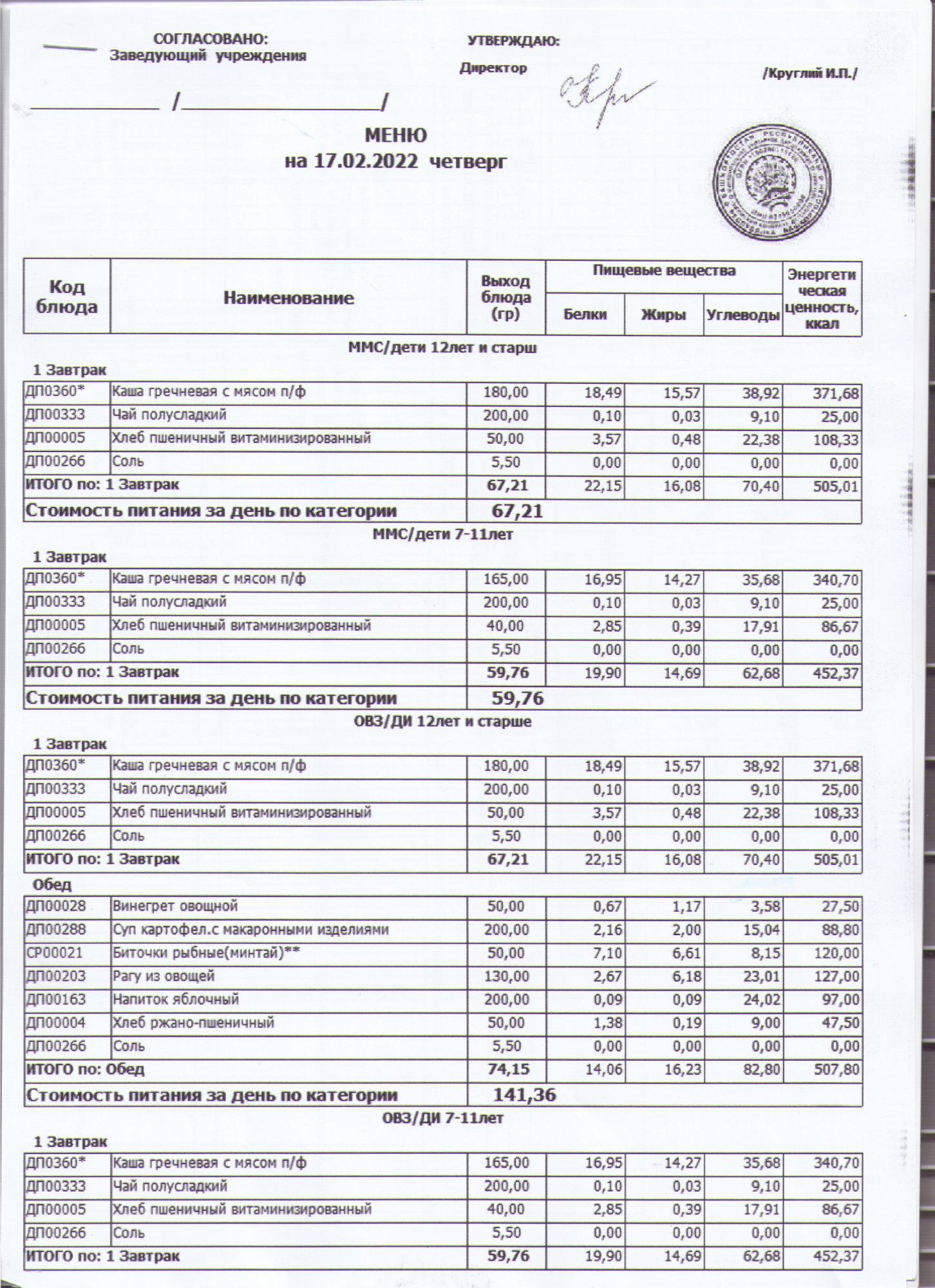 меню на 17.02.2022