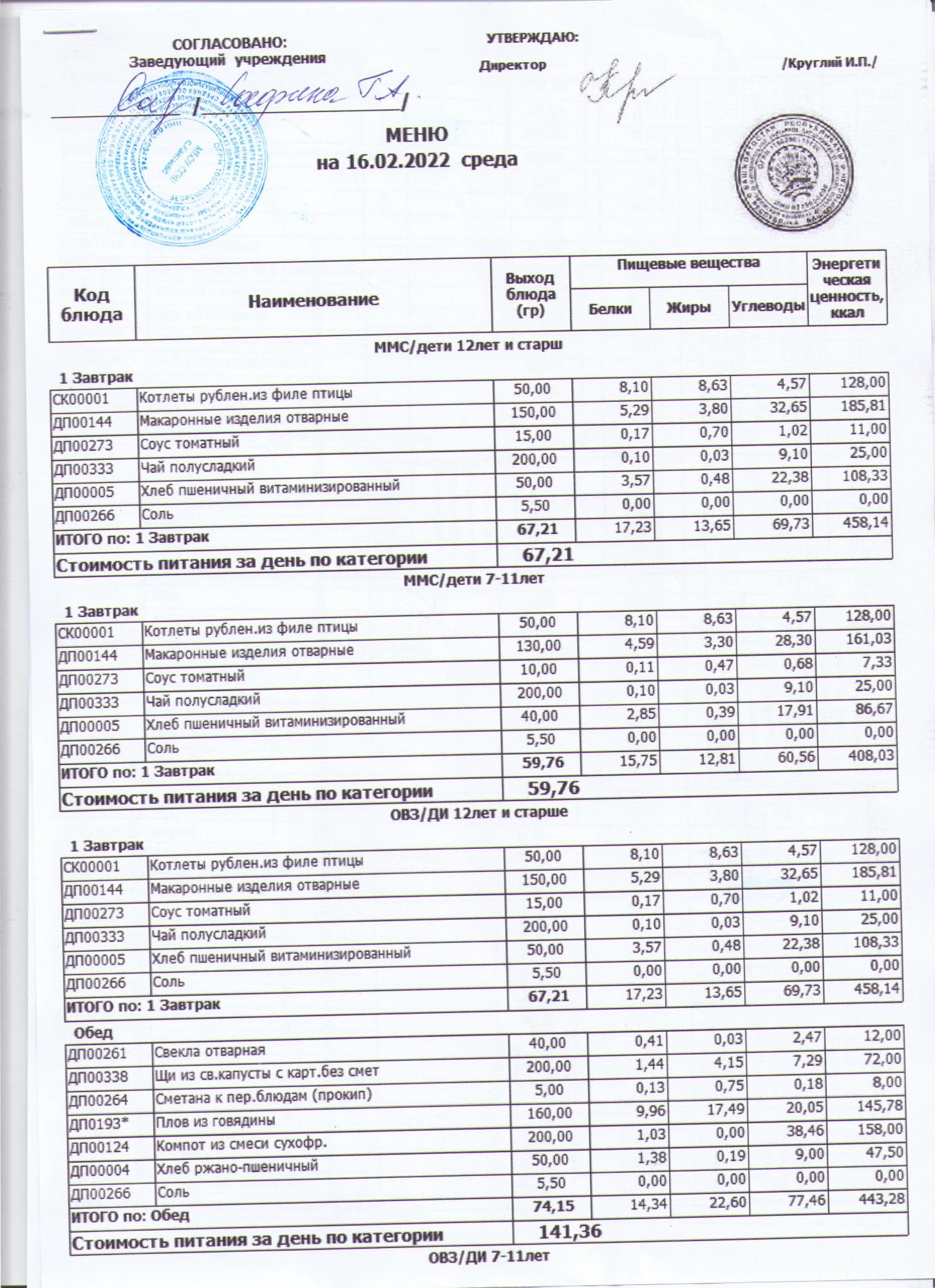 меню на 16.02.2022