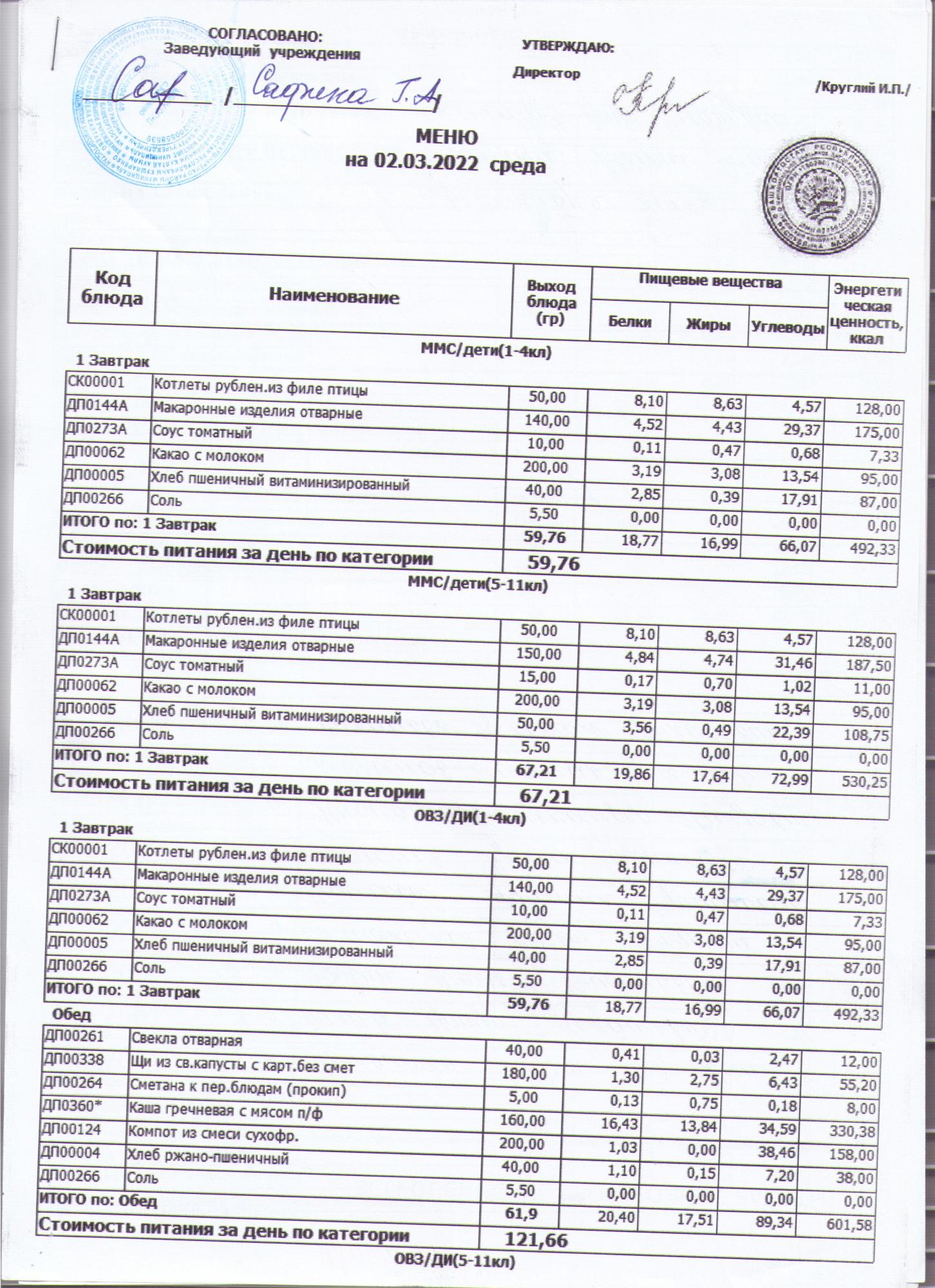 меню на 02.03.2022