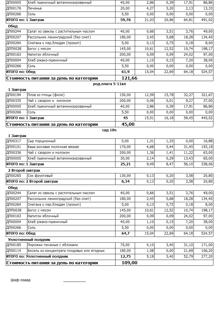 Примерное десятидневное меню.