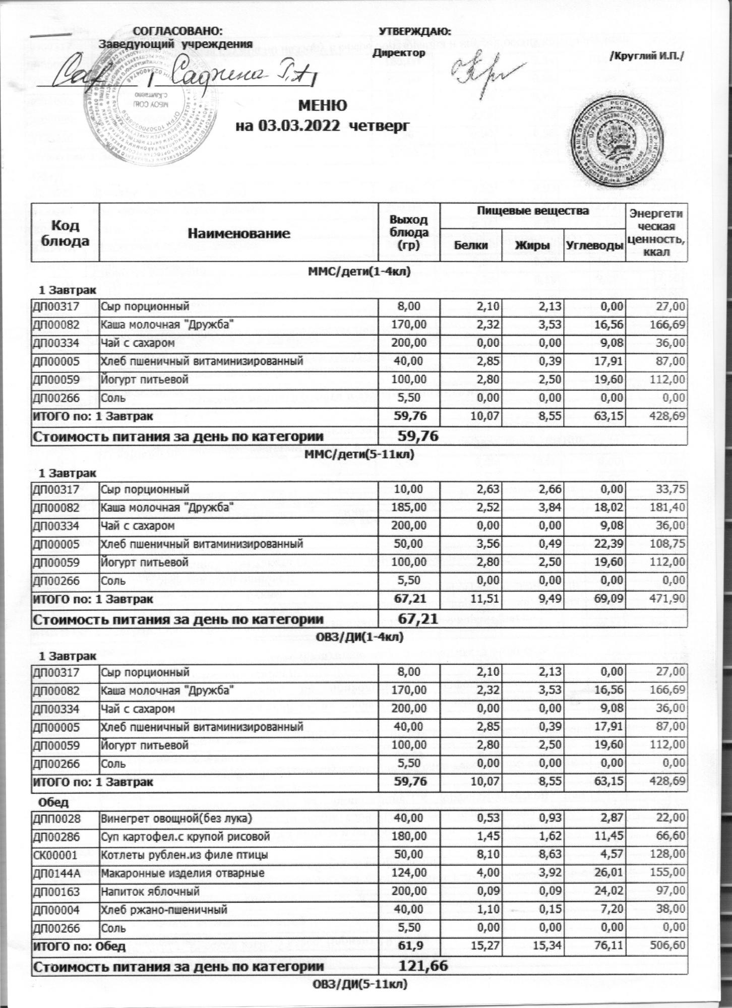 меню на 03.03.2022
