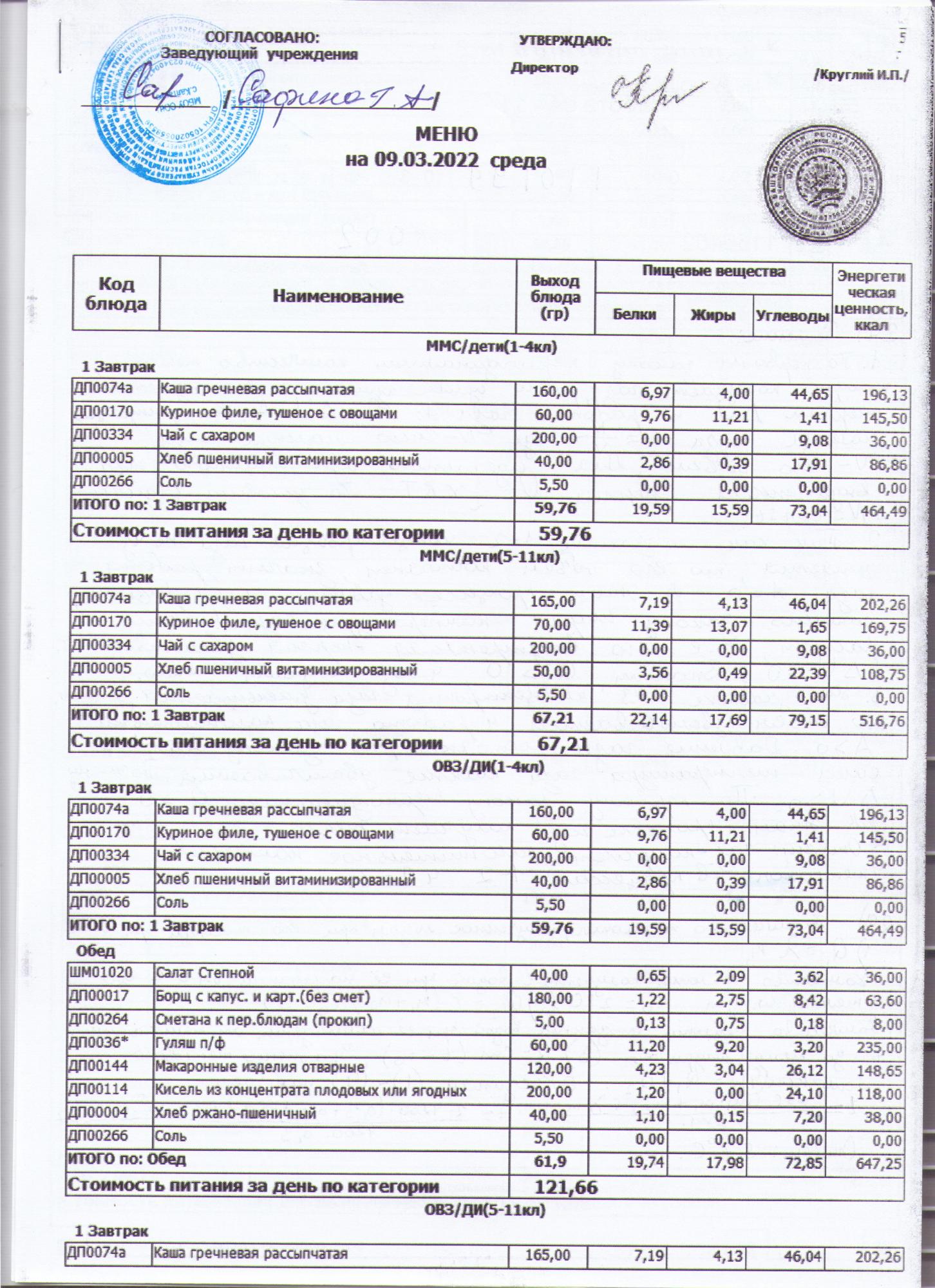 меню на 09.03.2022