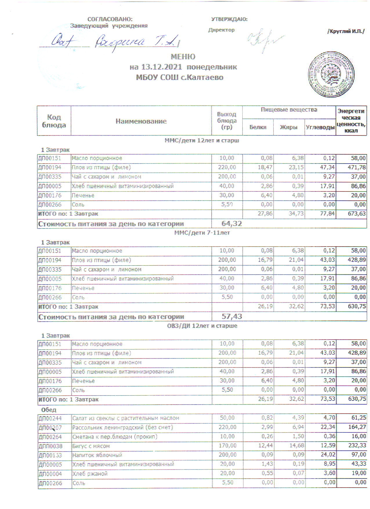 меню на 13.12.2021
